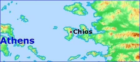 | Chi'os. (snowy). An island of the Aegean Sea, 12 miles from Smyrna. It is separated from the mainland by a strait of only 5 miles. Its length is about 12 miles, and in breadth, it varies from 8 to 18. Paul passed it on his return voyage, from Troas to Caesarea. Act 20:15. It is now called Scio . Smith's Bible Dictionary or |