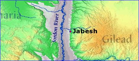 Ja'besh. (dry). Jabesh-gilead, or Jabesh in the territory of Gilead. In its widest sense, Gilead included the half tribe of Manasseh, 1 Chronicles 27:21, as well as the tribes of Gad and Reuben, Numbers 32:1-42, east of the Jordan; and of the cities of Gilead, Jabesh was the chief. It is first mentioned in Judges 21:8-14. Being attacked, subsequently, by Nahash, the Ammonite, it gave Saul an opportunity of displaying his prowess in its defence. 1 Samuel 11:1-15. Eusebius places it beyond the Jordan, six miles from Pella on the mountain road to Gerasa; where its name is probably preserved in the Wady Yabes . Smith's Bible Dictionary or |