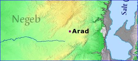 | A'rad. (a wild ass). A royal city of the Canaanites, named with Hormah and Libnah. Joshua 12:14. The wilderness of Judah was to the south of Arad." Judges 1:16. It may be identified with a hill, Tel 'Arad, an hour and a half northeast by east from Milh (Moladah), and eight hours from Hebron." Smith's Bible Dictionary or |